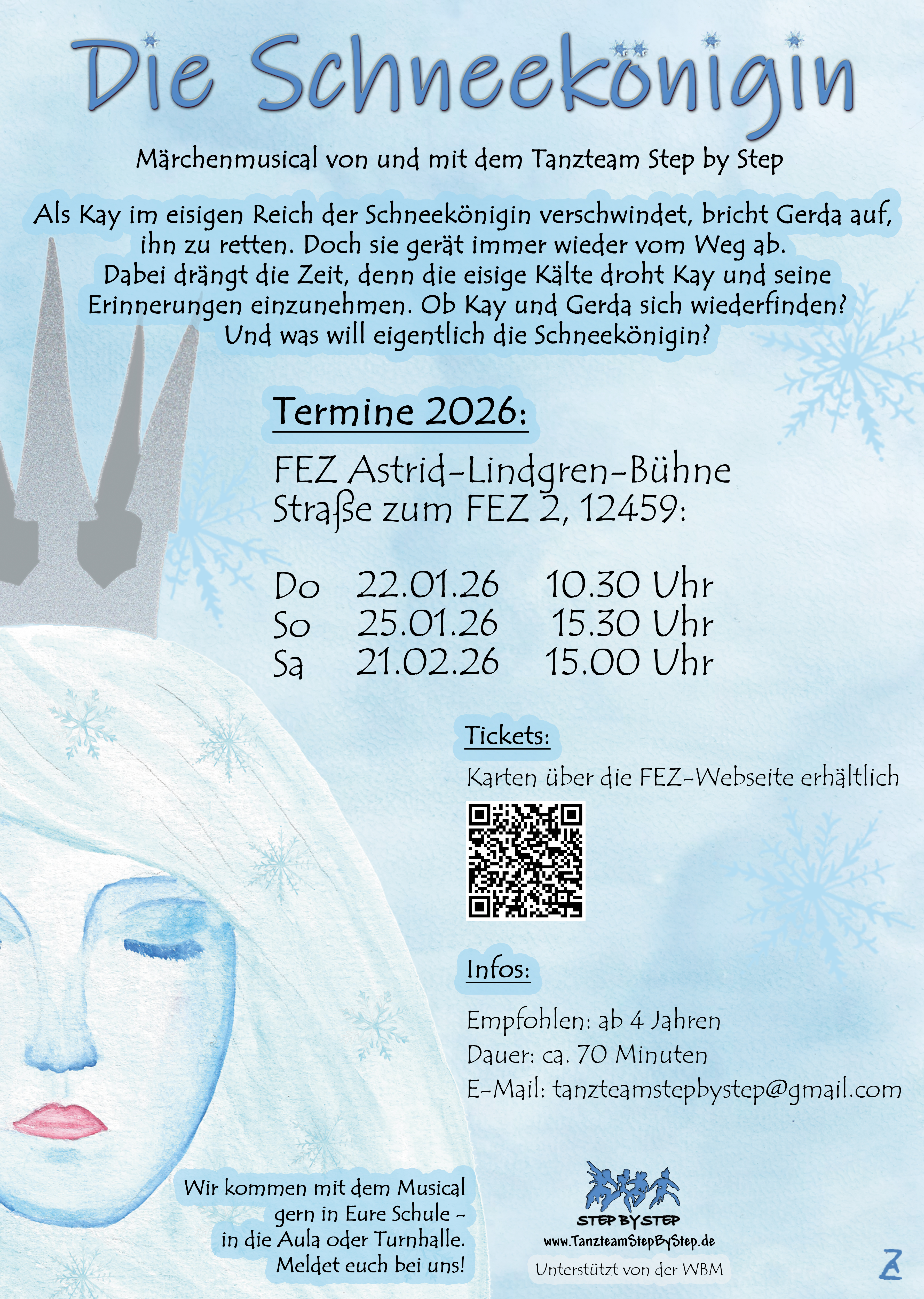 Die Schneekönigin im FEZ 21 Februar Sa 15:00–16:10 FEZ Astrid-Lindgren-Bühne, Str. zum FEZ 2, 12459 Komposition: Lexa A. Thomas Regie: Ana-Svenja Kiesewalter Choreografien: Evelyn Richter und Felicitas Vogelgesang